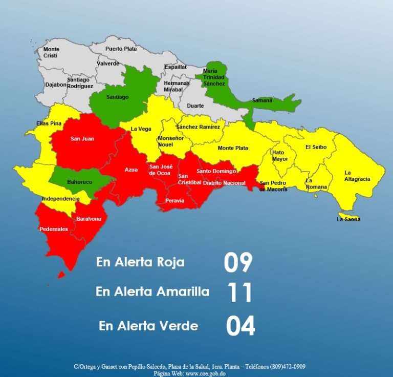 Asimismo, se mantienen en alerta amarilla las provincias La Vega, Hato Mayor, San Pedro de Macorís, Elías Piña, El Seibo, La Romana, Independencia y La Altagracia (incluyendo la Isla Saona), mientras que Bahoruco, Santiago, María Trinidad Sánchez y Samaná permanecen bajo alerta verde.